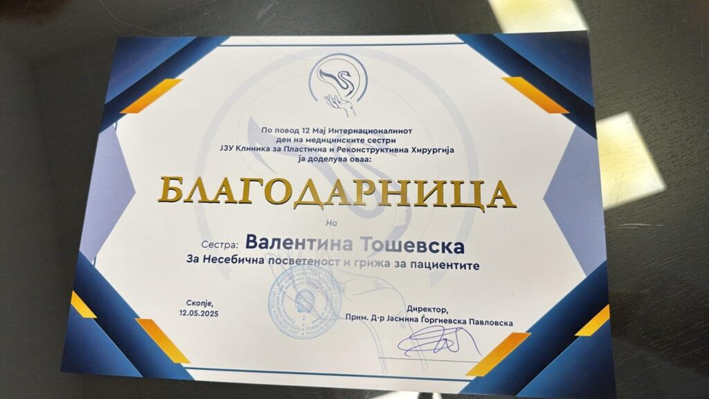 На Клиника за Пластична Хирургија се доделија Благодарници на сите Медицински Сестри по повод интернационалниот ден на медицинските сестри.